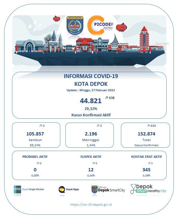 Depok | Pemerintah Kota (Pemkot) Depok kembali memperbarui data perkembangan kasus Covid-19 di Kota Depok. Berdasarkan data yang dirilis per tanggal 27 Februari 2022, terjadi penurunan yang signifikan pada kasus konfirmasi positif.