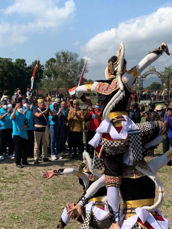 Kunjungan Menteri Pariwisata dan Ekonomi Kreatif/Badan Pariwisata dan Ekonomi Kreatif Republik Indonesia (Parekraf/Baparekraf RI) Sandiaga Salahuddin Uno ke Desa Wisata Bugisan, Prambanan, Klaten, Jawa Tengah (Jateng) disambut semarak perpaduan irama dari instrumen musik tradisional mengiringi gerak lincah para penari kuda lumping, Jathilan. Bersama Bupati Klaten Hj. Sri Mulyani, mereka membuka jalan bagi Mas Menteri.