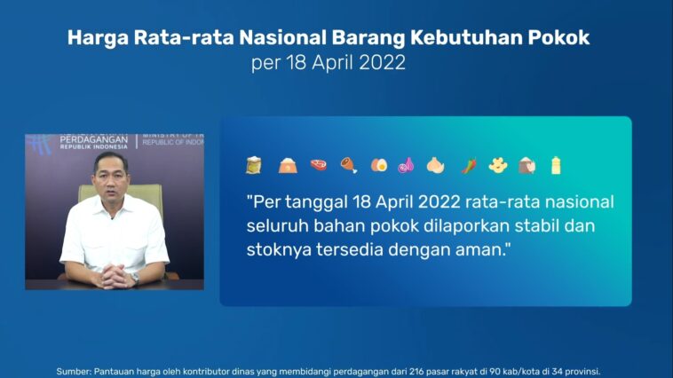 “Per 18 April 2022, rata-rata stok bahan pokok tersedia dengan aman,” kata Menteri Perdagangan (Mendag) Muhammad Lutfi melalui siaran virtual pada Selasa (19/4/2022).