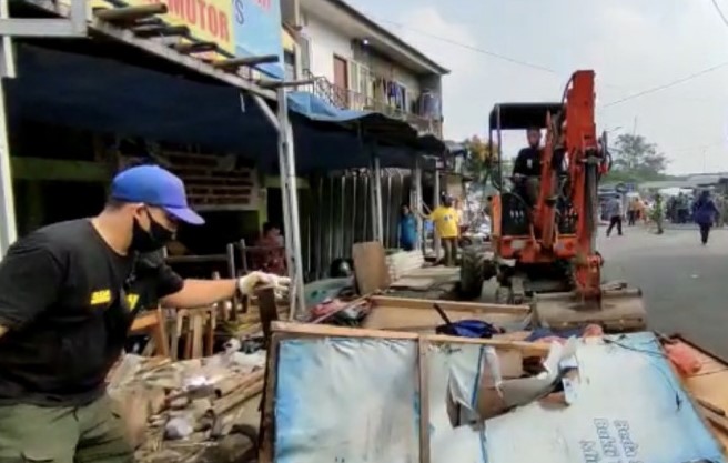 Depok | Satuan Polisi Pamong Praja (Satpol PP) Kota Depok menertibkan bangunan milik pedagang kaki lima (PKL) di sejajar rel Kelurahan Depok, Kecamatan Pancoran Mas, Kamis (17/03) kemarin. Penertiban dilakukan karena merupakan bangunan liar dan melanggar aturan.