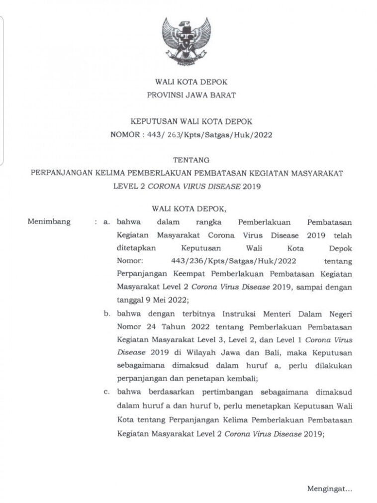 Depok | Depok kembali menerapkan perpanjangan Pemberlakuan Pembatasan Kegiatan Masyarakat (PPKM) Level 2 Covid-19, terhitung sejak 10 hingga 23 Mei 2022. Guna mengatur jalannya PPKM tersebut, Pemerintah Kota (Pemkot) Depok mengeluarkan Keputusan Wali Kota Nomor 443/263/Kpts/Satgas/Huk/2022 tentang Perpanjangan Kelima PPKM Level 2 Corona Virus Disease (Covid-19).