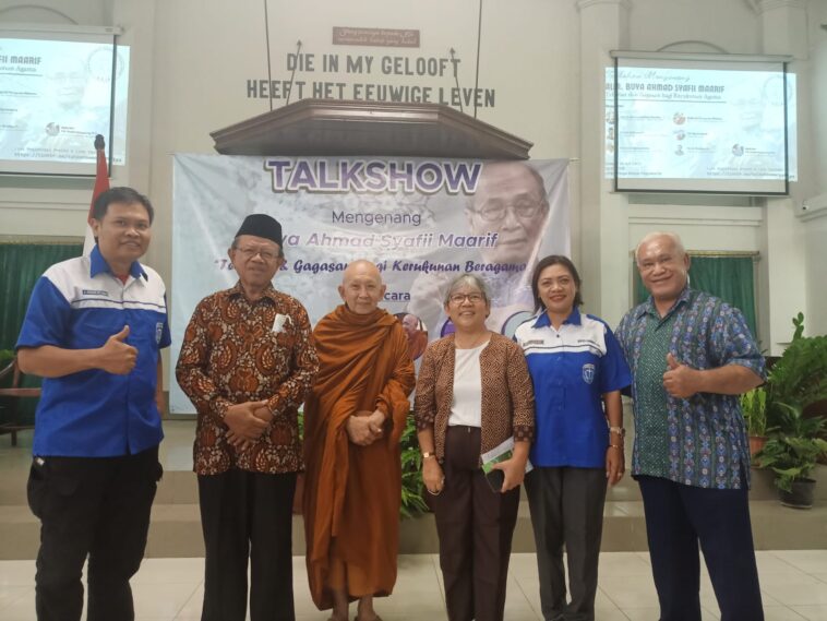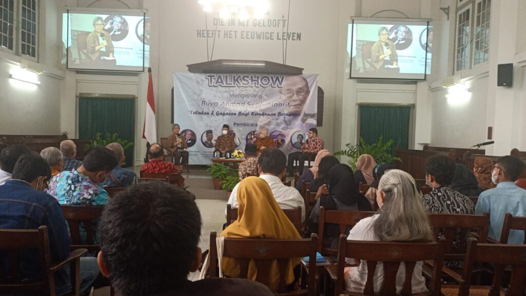 Yogyakarta | Teladan dan gagasan bagi kerukunan beragama menjadi tema khusus agenda talkshow mengenang alm. Buya Ahmad Syafii Maarif yang berlangsung di GPIB Marga Mulya Yogyakarta Jl. Margo Mulyo No.5, Ngupasan, Kec. Gondomanan, Kota Yogyakarta, Daerah Istimewa Yogyakarta 55122 pada Sabtu, 16/07/2022. Acara dihadiri dari berbagai komunitas pemimpin keagamaan, Ormas DPD GAMKI DIY Tokoh Masyarakat lintas agama yang dilaksakan secara onsite dan daring serta secara live YouTube.