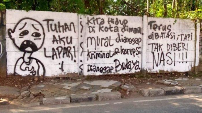 “Tuhan aku lapar. Kita Hidup di kota dimana mural dianggap kriminal dan korupsi dianggap budaya. Terus dibatasi tapi tak diberi nasi,” berikut isi tulisan dalam mural tersebut.