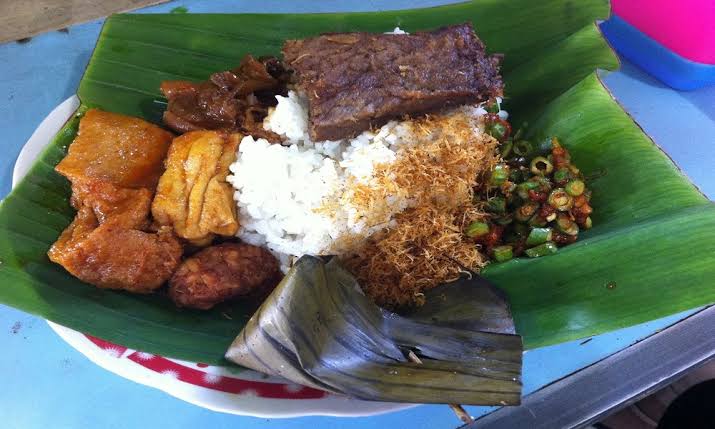 Nasinya dibungkus daun jati agar tahan lama, ditemani lauk sederhana berupa tempe, tahu, dan telur dadar. Belakangan, menunya dimodifikasi dengan menambah 40 jenis lauk lainnya, di antaranya sate telur puyuh, sate ampela, telur gulai, dan kuah cumi hitam.