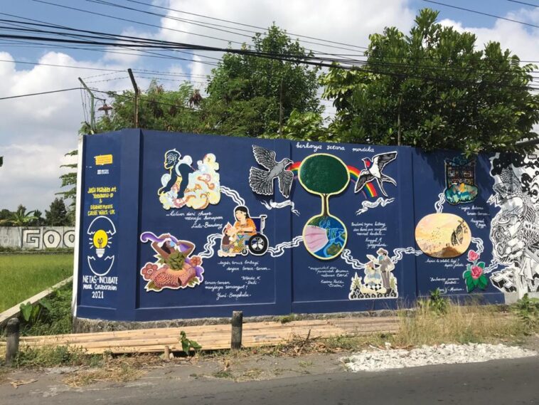 Kolaborasi para difabel seniman dua negara, Indonesia – Wales, UK, mewujud dalam dua karya mural lintas negara, bertajuk “netas-incubate”. Satu karya mural berada di Yogyakarta. Tepatnya bisa disaksikan di Jalan Pelemsewu, Pandes, Kelurahan Panggungharjo, Kecamatan Sewon, Kabupaten Bantul. Satu karya mural lainnya berada di Inggris, berlokasi di 81 Partridge Rd, Cardiff CF243QY, Wales, United Kingdom.